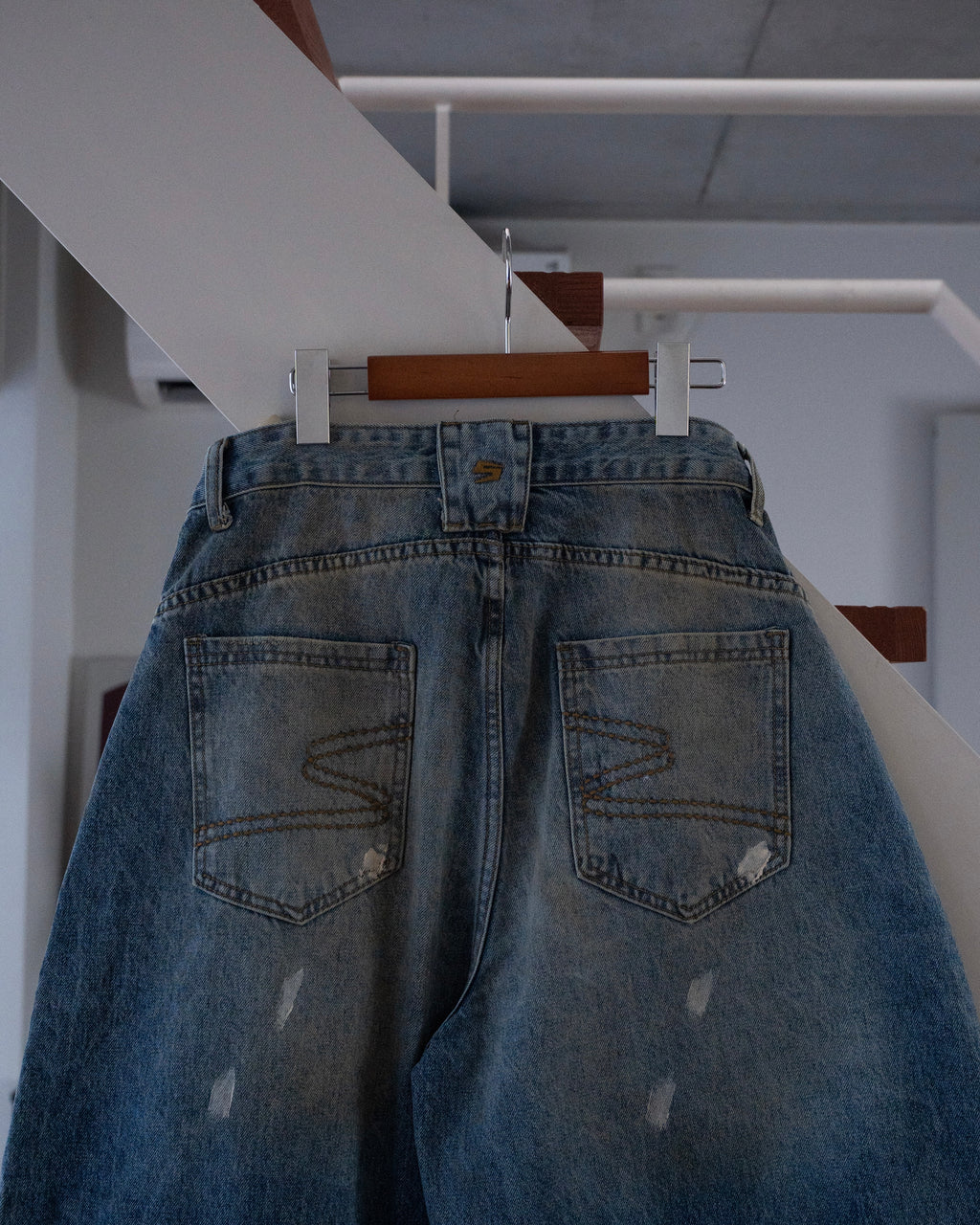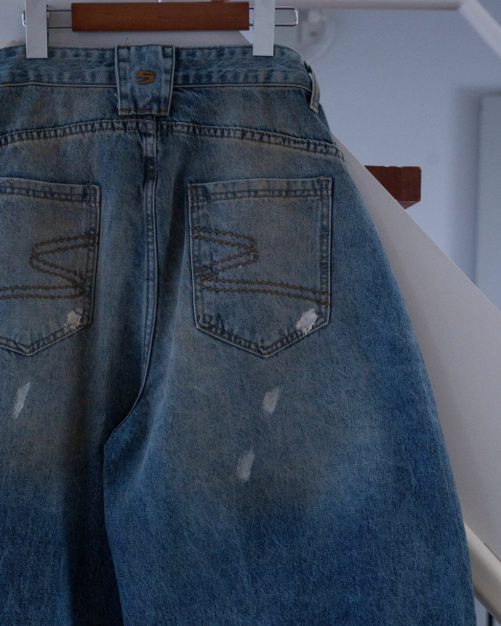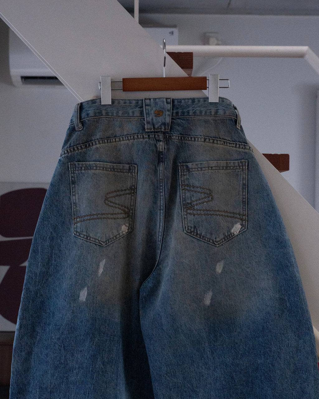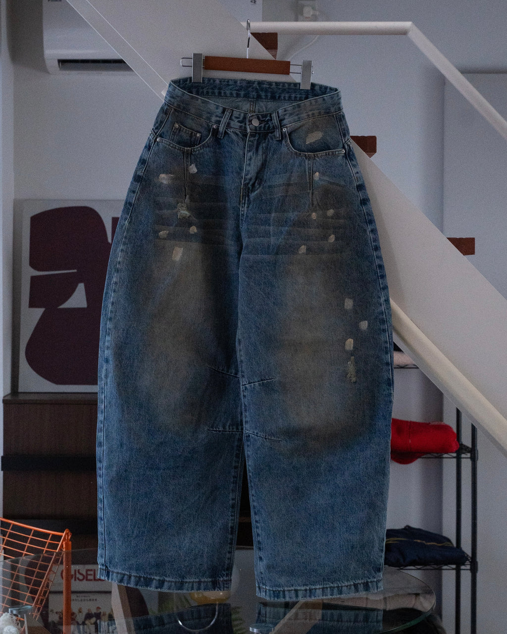 ヴィンテージライクな色落ち加工が特徴のワイドデニムパンツ。