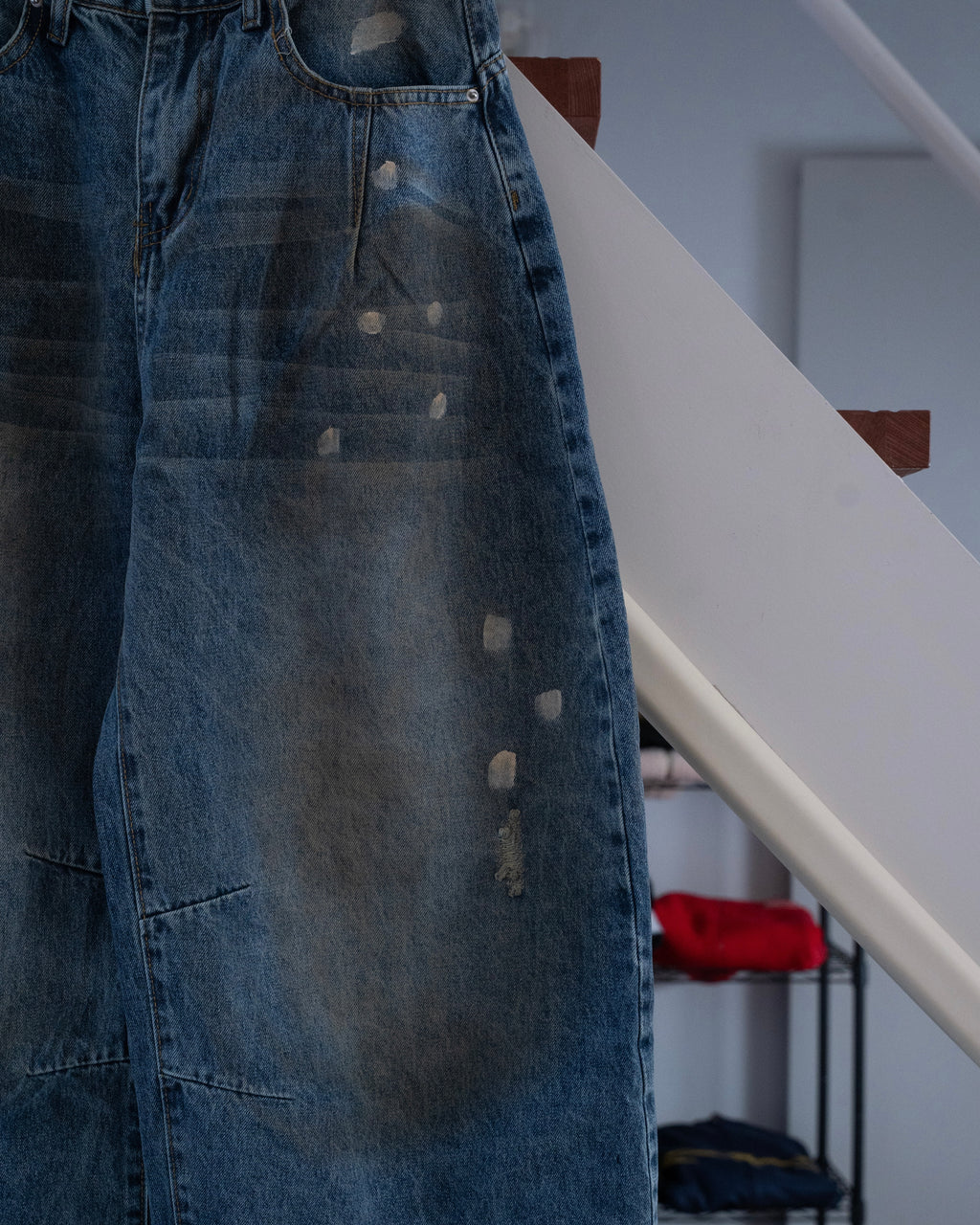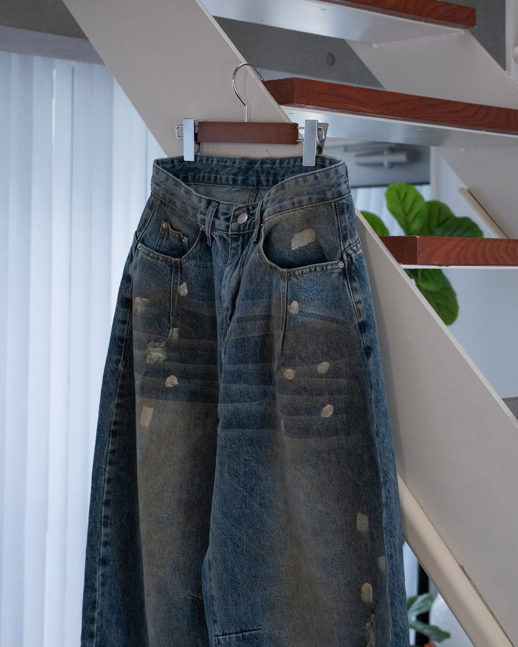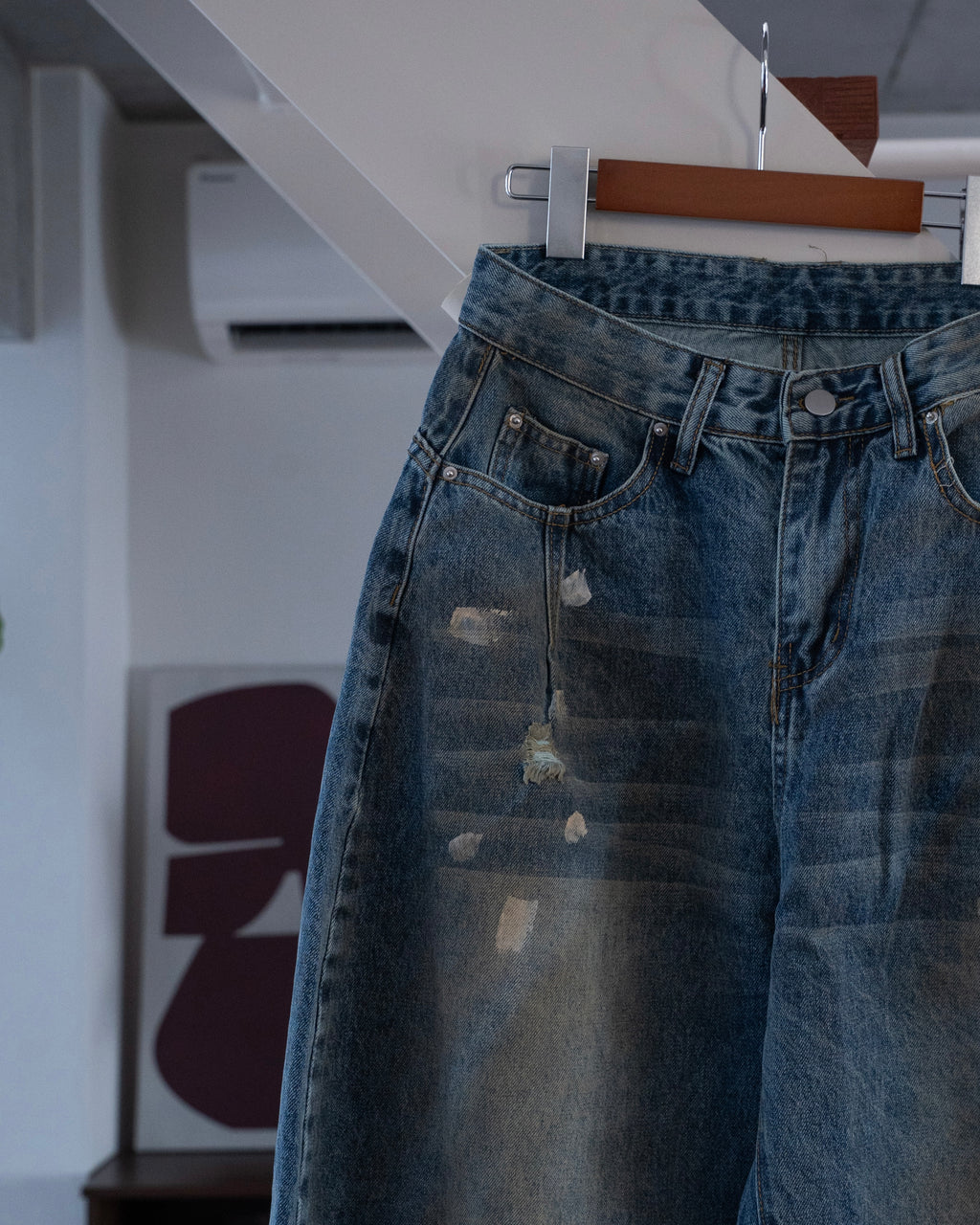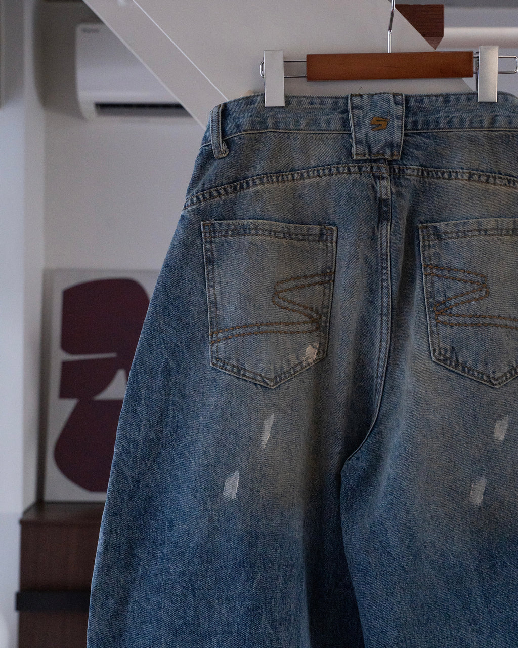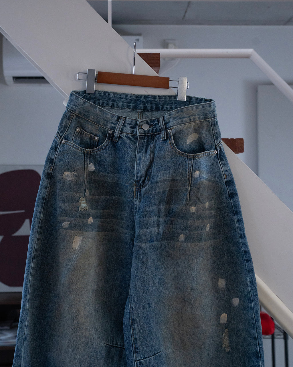 ヴィンテージライクな色落ち加工が特徴のワイドデニムパンツ。