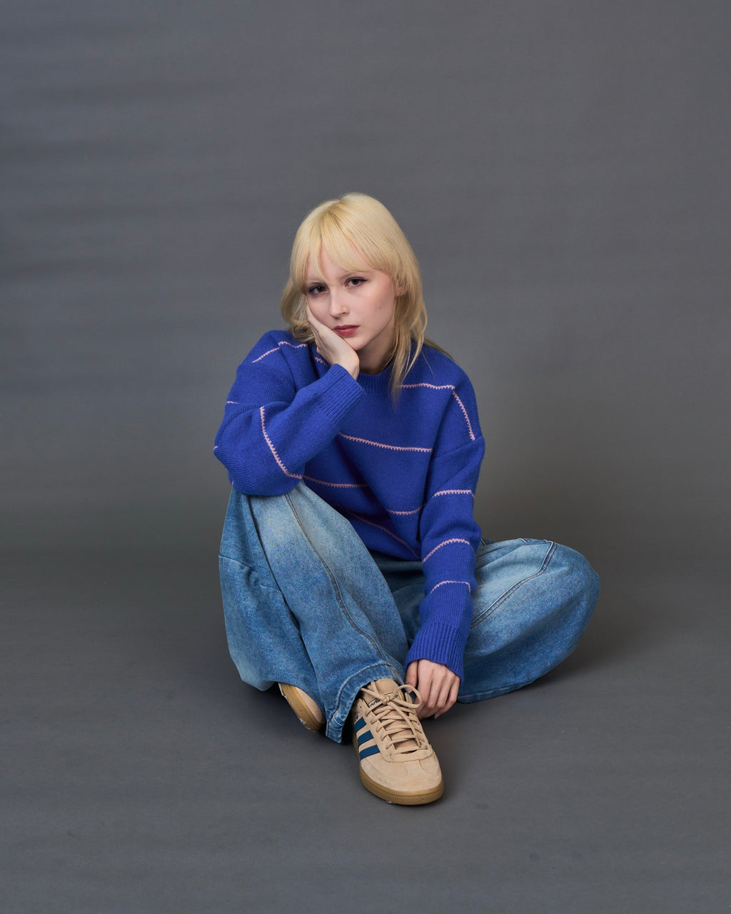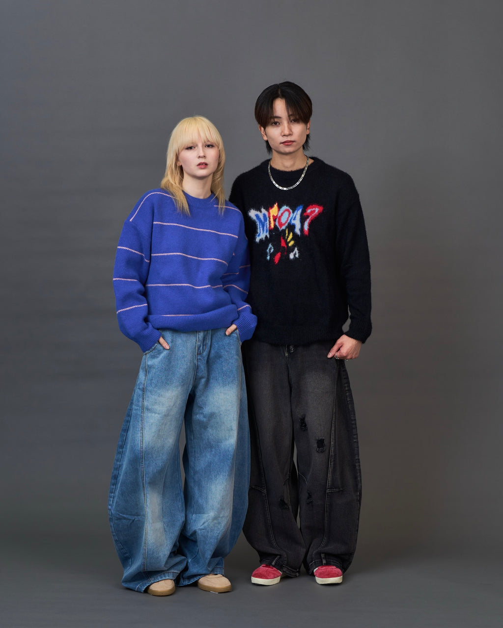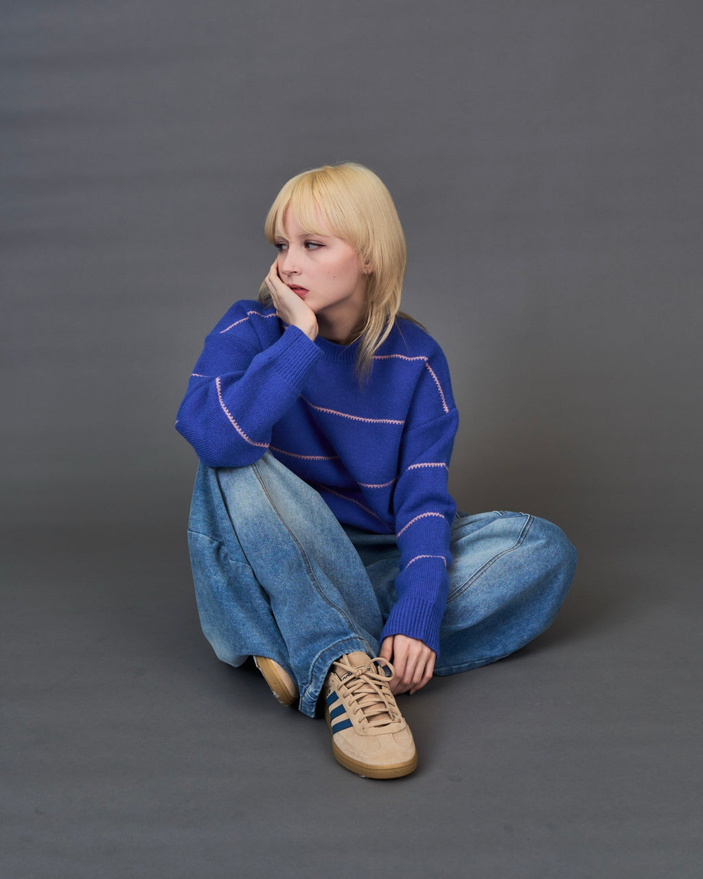 王道のボーダーニットをベースに blue×pail pinkの配色で遊び心を持たせた一着。
