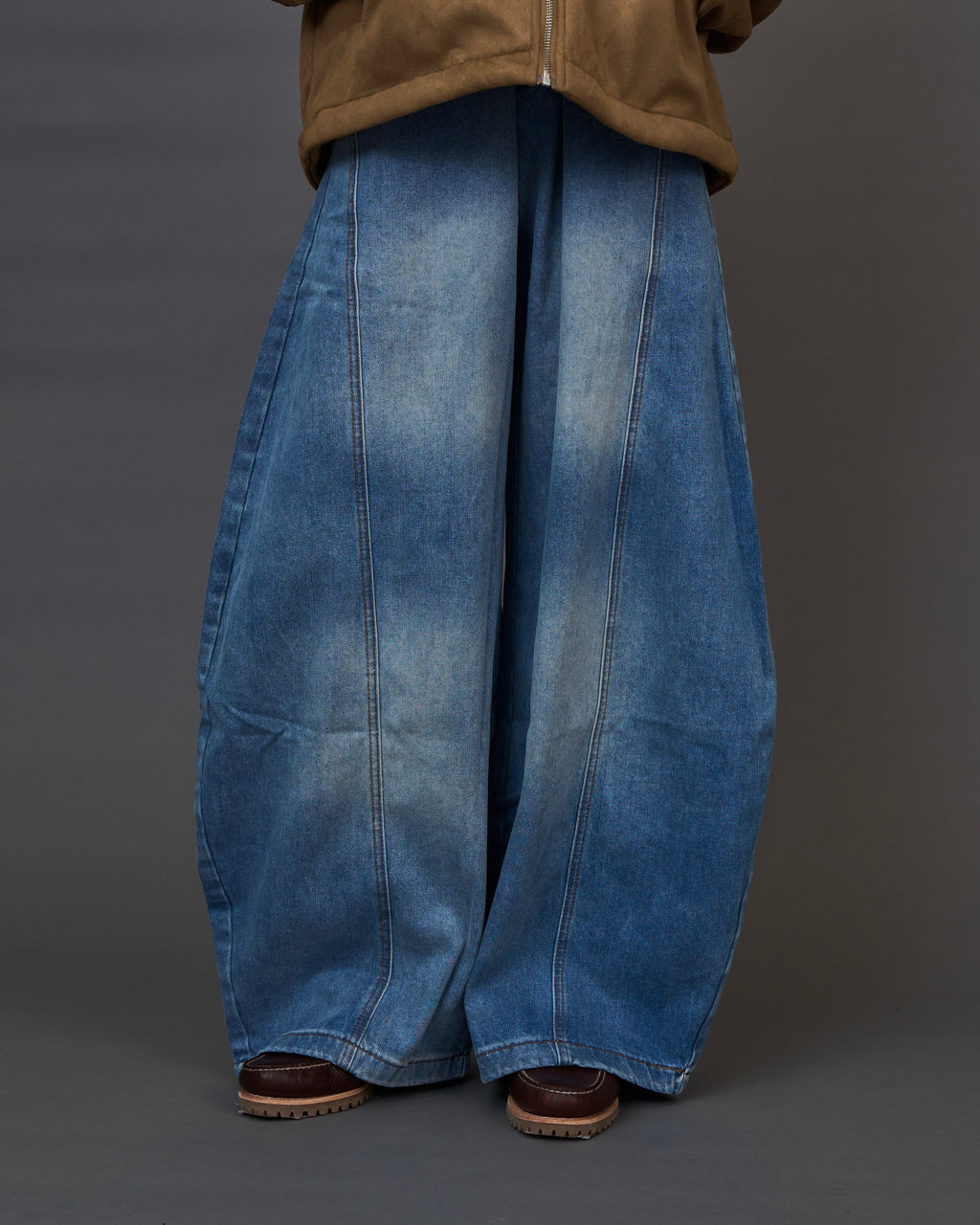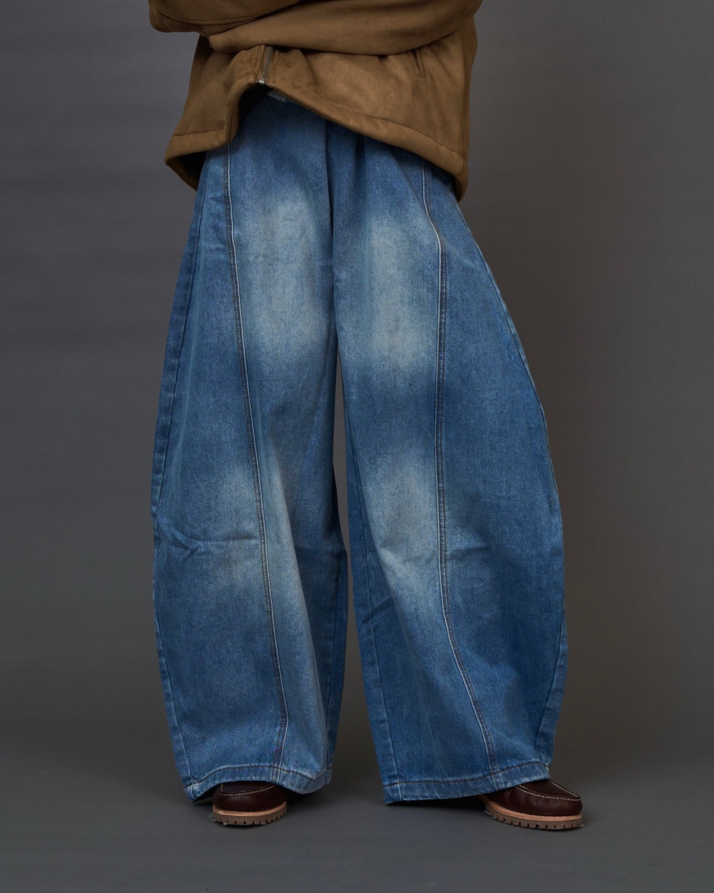 ヴィンテージライクなフェード加工が印象的な、ライトウォッシュのワイドデニムパンツ。大胆なオーバーサイズシルエットで存在感がありながら、快適な着心地と動きやすさも兼ね備えています。現代的なストリートスタイルにレトロなニュアンスをプラスしてくれる一本です。