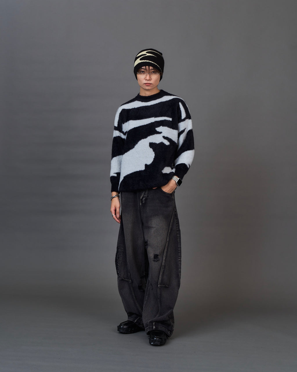 バギーデニム(例:ビーハイブウォッシュドデニム SL0034)+短丈パーカー+スニーカーで合わせたY2Kスタイルがおすすめ。カラーレンズのサングラスで雰囲気アップも