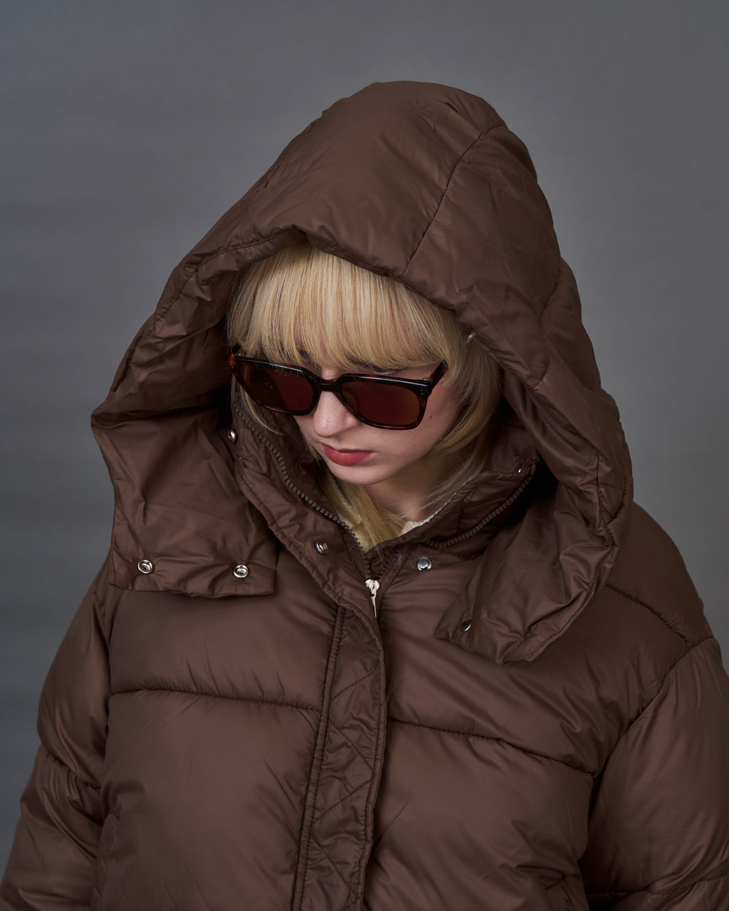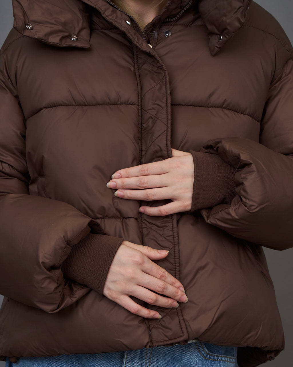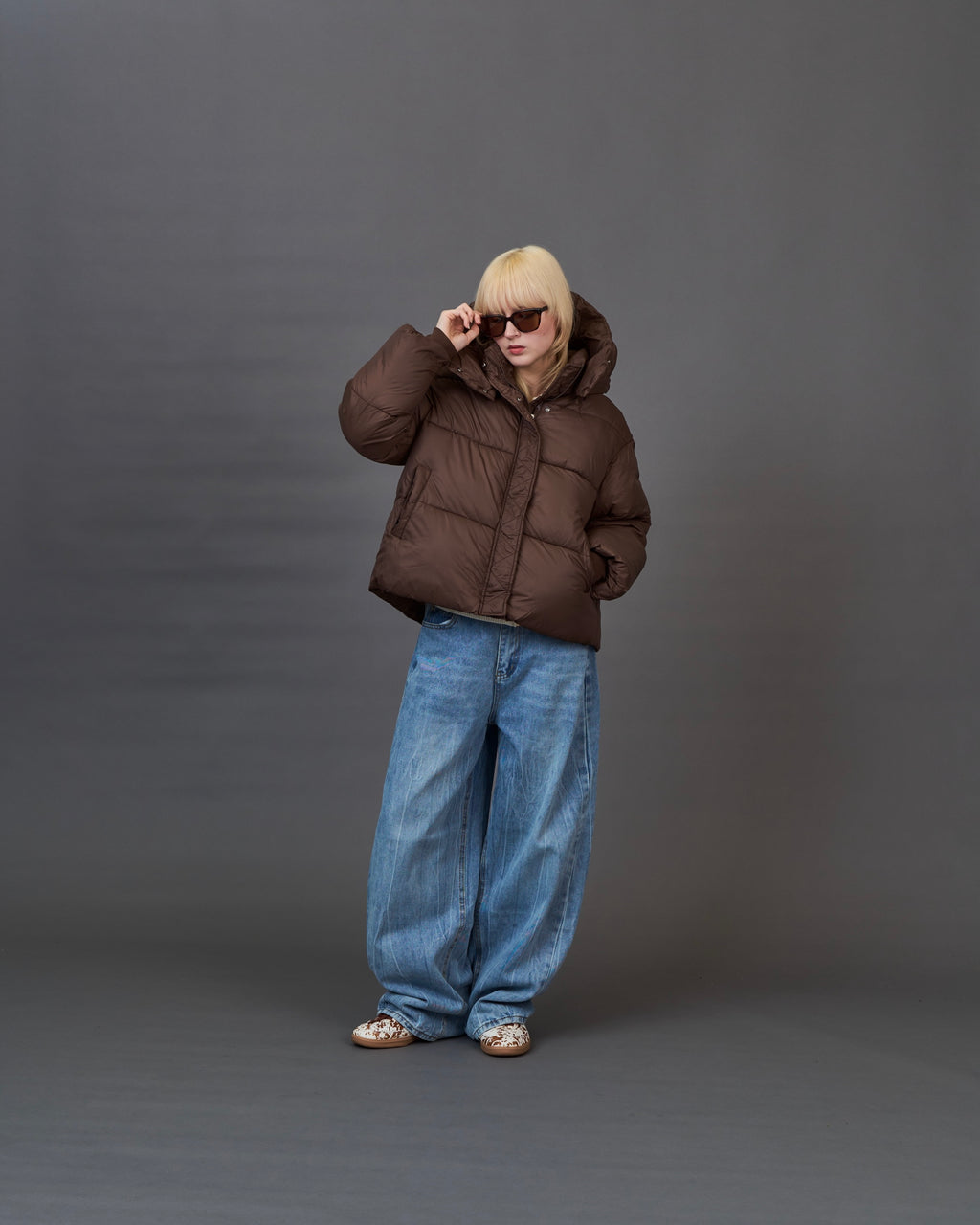 程よいボリューム感とショート丈シルエットでバランス良く着られるダウンジャケット。ミニマルなデザインながら存在感があり、デイリーからタウンユースまで幅広く活躍します。フード付きで防寒性も高く、冬のアウターとして頼れる一枚。ブラウンとブラックのベーシックなカラーバリエーションで、スタイリングを選ばず着用可能です。