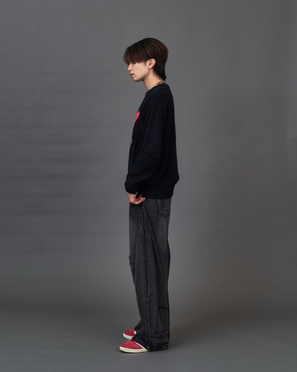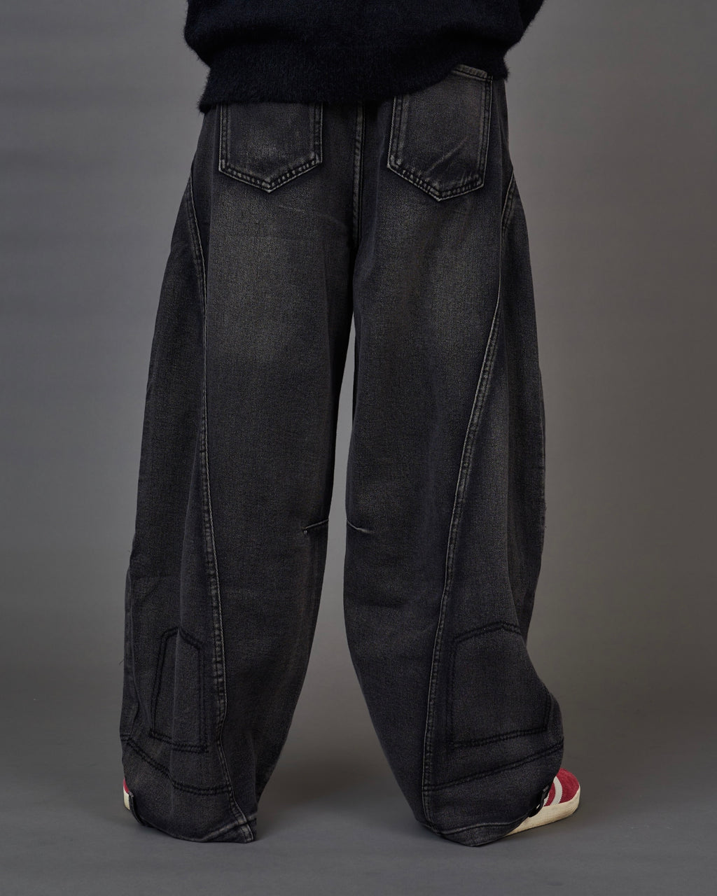 大胆なオーバーサイズシルエットに、ダメージ加工とフェード感をプラスしたブラックワイドデニム。さりげないリップ加工が武骨な雰囲気を演出し、ルーズなフィット感で快適な着心地も魅力。ストリート感とグランジのエッセンスを融合させた万能な一本です。