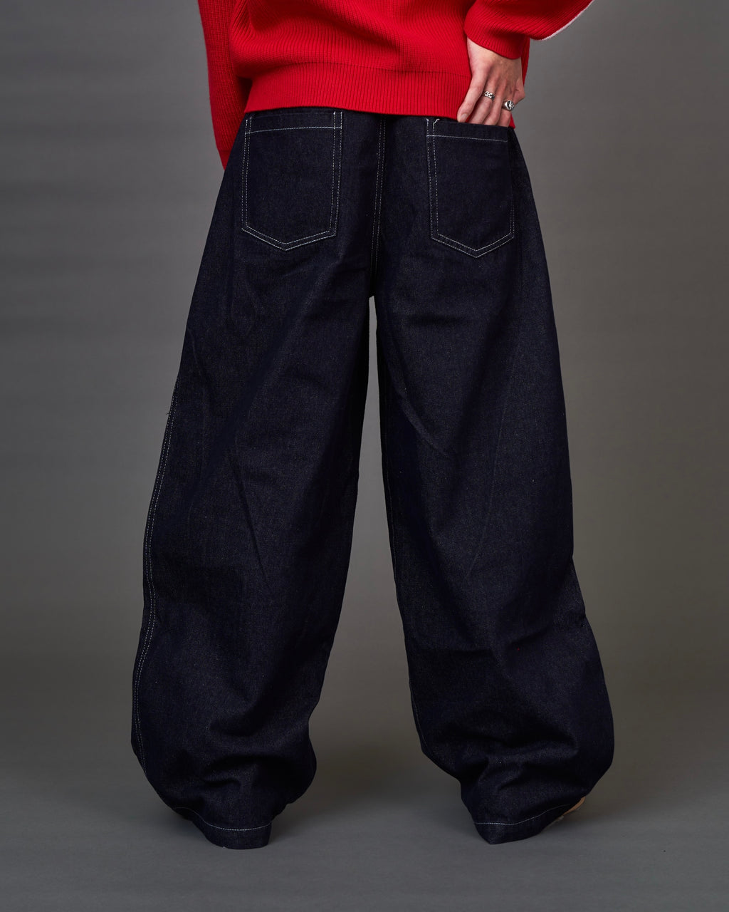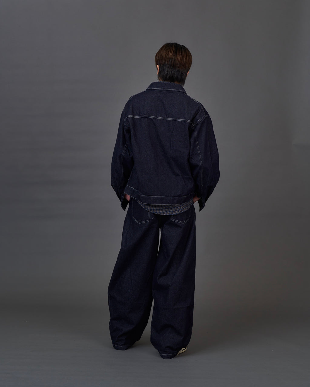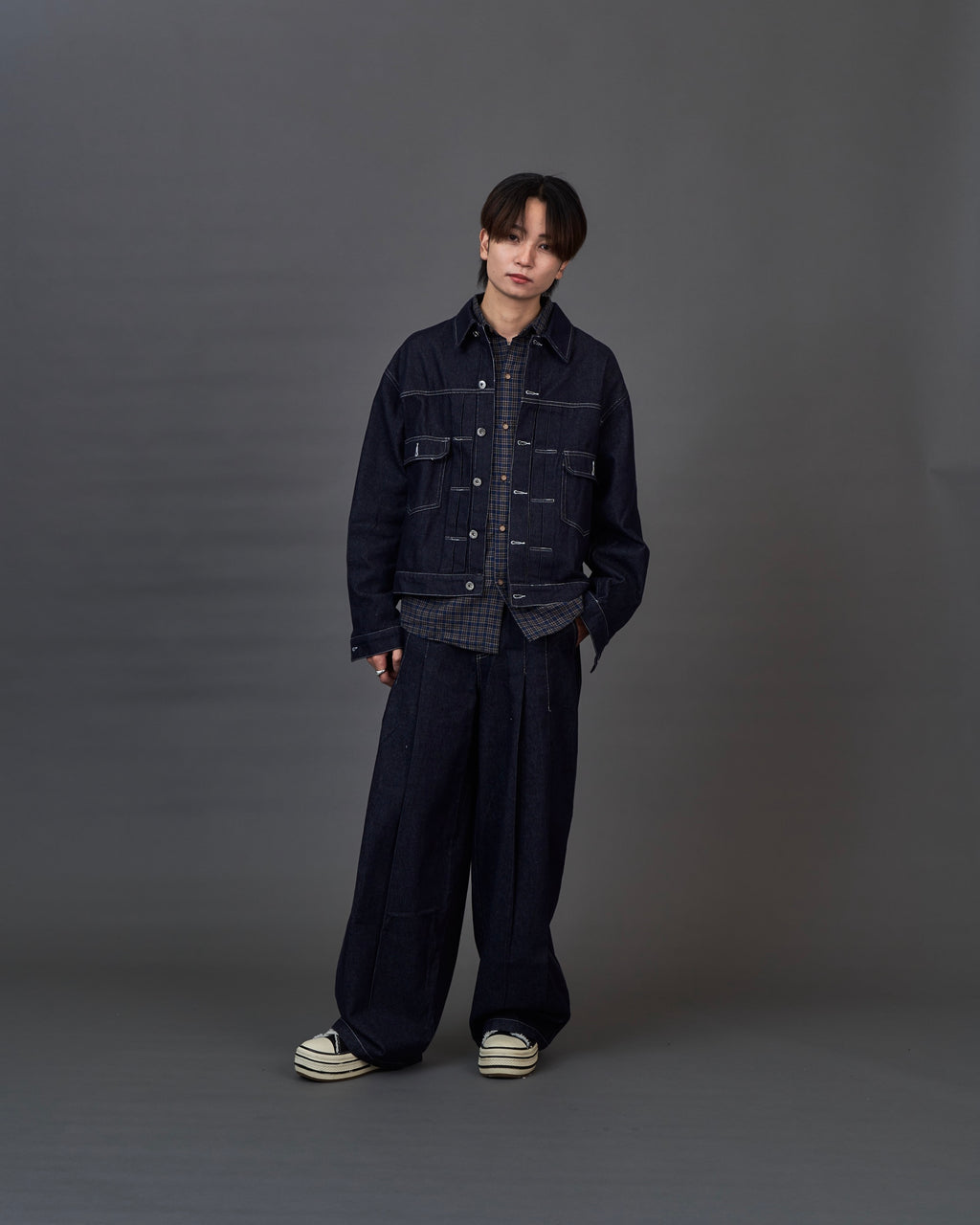 大胆なシルエットが魅力のワイドプリーツデニムパンツ。フロントに施された深いプリーツが立体感を生み出し、ストリート感とモード感を兼ね備えています。しっかりとしたダークウォッシュデニムを使用し、カジュアルにも個性的なスタイリングにも対応できる万能な一本です。